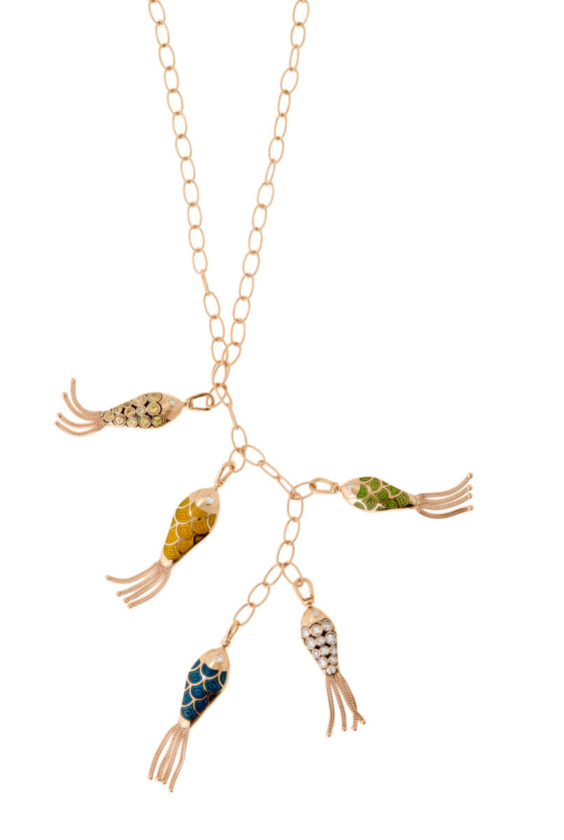 The designer’s Fish For Love necklaces feature little gold and enamel schools of fish with multi-strand gold tassels hanging from their back ends that make them appear to be swimming along.