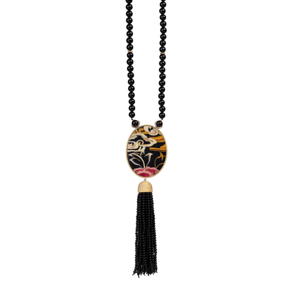 The legendary Greek jeweler LALAoUNIS is eternally inspired by ancient gold motifs and techniques dating back to the dawn of time. This is clear in the gold necklace with a double tassel.