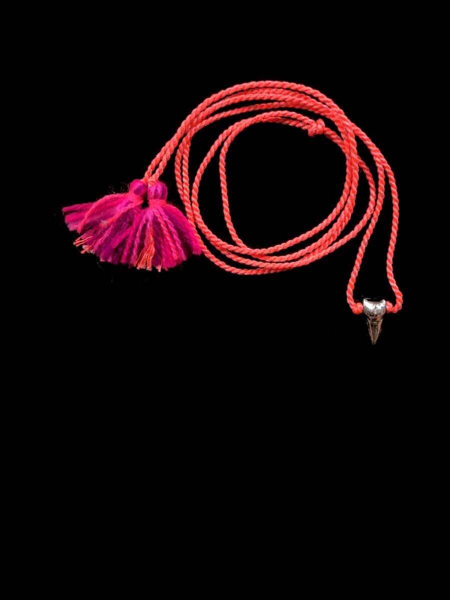 The designer’s tassel necklaces echo the traditional silhouette of Indian cord necklaces that also can be found in Mexican work. The jewels feature a single silver or gold shark tooth pendant suspended from colorful or black knotted cords with a slide that can be used to make a perfect fit and buoyant bushy tassels at the ends.