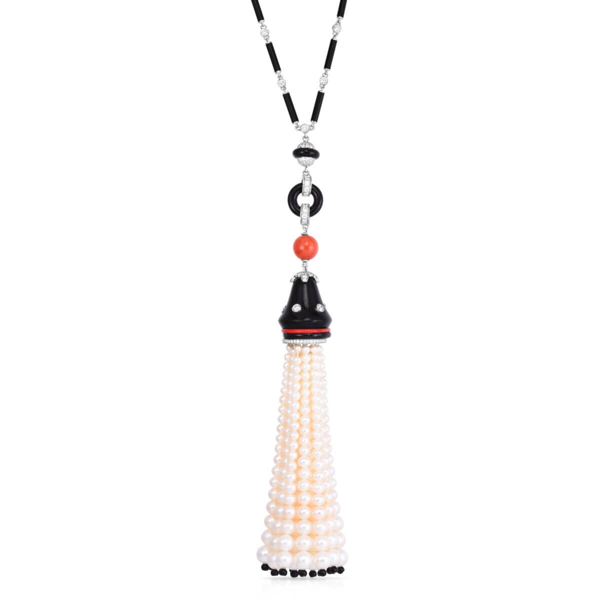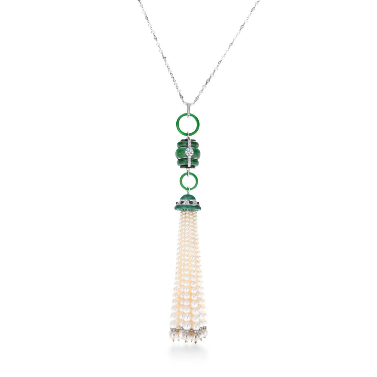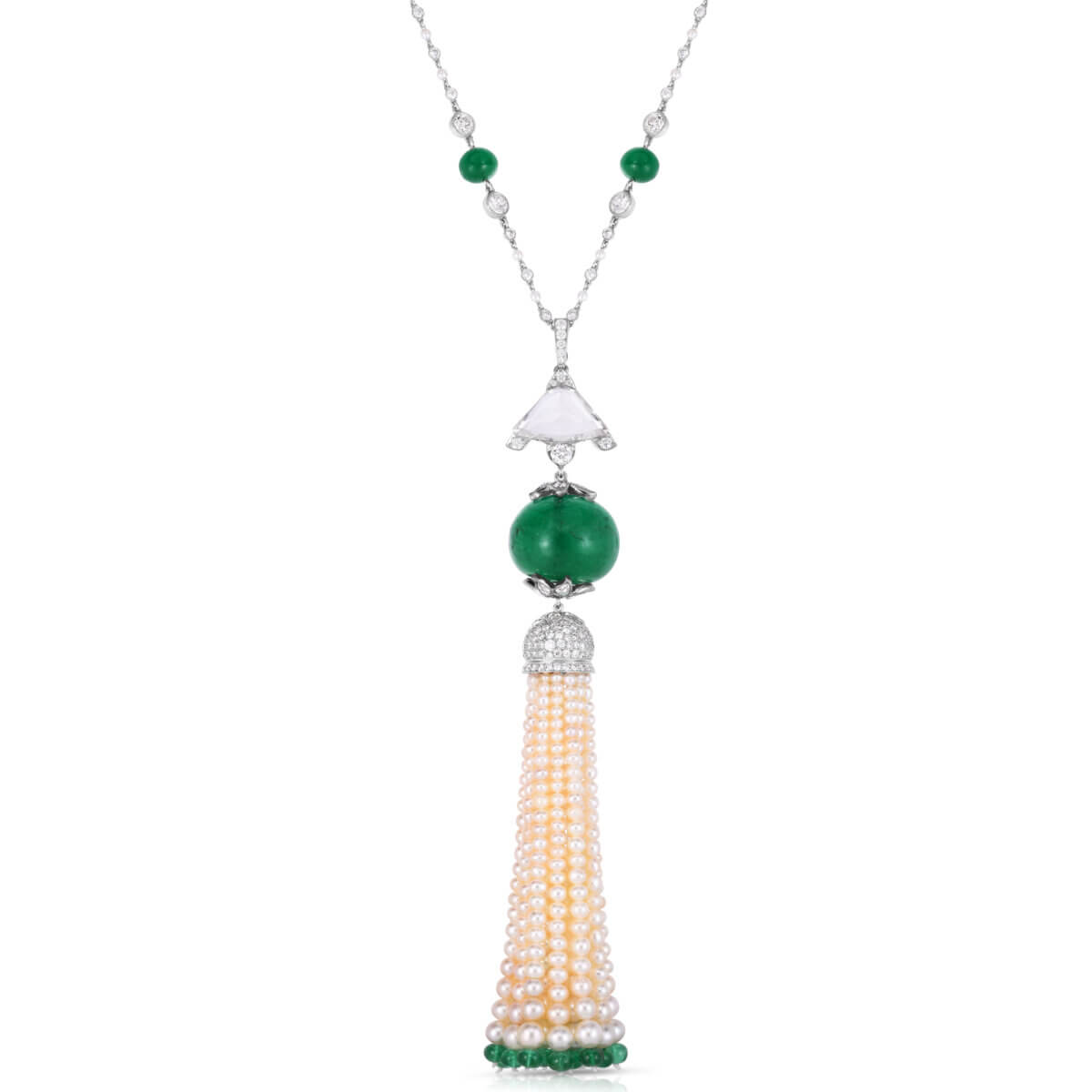 The pearls and precious gems in the tassels are strung in graduated rows. Contrasting gems finish off the bottom of some tassels. Specially cut gems form circular accents on the tassel caps and pendants. The patterns on some tassels are picked up and carried on in the necklaces.